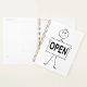 Restez organisé avec un sourire en utilisant ce planificateur en spirale montrant une figure en bâton portant un panneau "OUVERT". Parfait pour la planification, l'établissement d'objectifs ou la planification d'entreprise, le design amusant ajoute motivation et personnalité à votre quotidien. Idéal pour les entrepreneurs, les étudiants ou toute personne qui aime la papeterie créative.