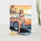 Portrait moderne d'une charmante fille, avec une voiture de sport, dans un magnifique paysage de mer et de plage, avec des couleurs chaudes au coucher du soleil. Graphique informatique