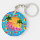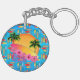 Fille de surfer avec le panneau de surf, les palmiers, le coucher du soleil, et les fleurs de ketmie.
