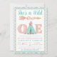 Fille folle invitations à une fête d'anniversaire avec un teepee bleu turquoise et des lettres et flèches rose et or sur un arrière - plan de design tribal bleu rose et turquoise. Ces invitations sauvages de fête d'un premier anniversaire sont facilement customisées pour votre événement en ajoutant simplement vos détails.