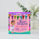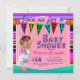 Invitation baby shower Fiesta avec une petite fille mignonne portant une robe colorée Puebla sur un arrière - plan serape multicolore. Ces adorables invitations pour la petite fille Fiesta bébé douche sont facilement customisées pour votre événement en ajoutant simplement vos détails.