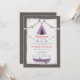 Une invitation à la fête d'anniversaire pour filles avec un thème campant rustique. L'Invitation a une illustration d'un tipi violet avec un motif chevron en haut et un canot violet en bas. L'Invitation est également doté d'un toit en chaume et d'un arrière - plan d'inspiration bois. Personnalisez le texte avec les détails de votre occasion.