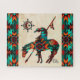 Profitez de cette fin unique "One of a Genre" du Puzzle Trail! Il comprend une extrémité sud-ouest amérindienne de la piste indienne et cheval sous le soleil sur un Arrière - plan de grès...Entouré d'une frontière en Turquoise, Orange & Noir! Design D'Art Original Par L'Artiste Kerry Miller.