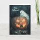 Frohe Halloween-Begrüßung mit einer lustigen Halloween-Szene mit einer schwarzen Katze und einem Geist, der in einer Kürbislaterne Kürbis nach einer anderen schwarzen Katze sucht