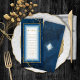 Un arrière - plan d'aquarelle dans les tons du bleu royal à la marine est surmonté d'une abstraite de lignes dorées fines et d'effets lumineux scintillants pour créer les pièces de cette belle suite mariage. La carte "Menu" mariage présentée ici présente également des calligraphies élégantes et des cadres en dégradé pour maintenir votre texte à l'avant et à l'arrière. Ajoutez facilement vos propres initiales, la date du mariage et les sélections de menu en utilisant le modèle fourni. Recherchez ID867 pour voir d'autres pièces et choix de couleurs pour cet ensemble.
