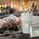 Ein Aquarellhintergrund in den Farbtönen von Minze bis Salbei wird durch ein abstrakte von edlen Goldlinien und glitzernde Lichteffekte überragt, um die Teile dieser wunderschönen Hochzeitssuite zu kreieren. Der hier gezeigte Hochzeitspapier-Becher verfügt auch über einen Farbverlauf, einen diamantförmigen Rahmen, um die Initialen der Braut und des Bräutigams und das Hochzeitstag zu halten. Fügen Sie einfach eine persönliche Dankeschön-Nachricht mit der mitgelieferten Vorlage hinzu. Suchen Sie ID867, um weitere Teile und Farboptionen für dieses Set zu sehen.