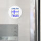 Runder Magnet mit der finnischen Flagge, die einen weißen Hintergrund mit einem blauen Skandinavier hat, oder Nordic Cross. Hier zeigt es mit dem Wort FINLAND unter der Flagge. Oben, ist ein Ort für Ihren Namen, in blauen Schriften, oder jemand anderes, wenn Sie ein Geschenk personalisieren wollen. Großes Gastgeschenk oder kleine Geschenk.