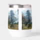 An autumn art design of a fir tree and a person enjoying some peace and quiet.