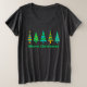 Modernes geometrisches Design aus fünf Tannenbäumen in aquamarin, türkis und goldgelb. Es heißt "Frohe Weihnachten" in passendem grünen Text.