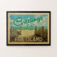 Dieses Greetings From Fire Island Vintage Postkartendesign besticht durch einen Sandstrand mit türkisblauem Meerwasser und einen blauen Himmel mit blauen, blauen Wolken. Im Vintage Reisen Stil.