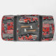 This duffle bag displays a dynamic pattern of red fire trucks and scattered fire axes against a muted gray background, featuring hints of yellow. The various fire truck models are rendered with attention to detail, complete with ladders and a sense of action. A prominent red side pocket with a fire department emblem includes personalized text for "JENNY SAMSMITH," "FIRE DEPARTMENT," and "Vancouver B.C." Personalize with your name and department home town and more. monogram
