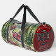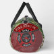 This duffle bag features a captivating pattern of red fire trucks navigating a winding road through a lush green forest. The vibrant scenery with tall pine trees and a subtle mountain backdrop creates an adventurous feel. A prominent side pocket with a fire department emblem is personalized with "FIRE RESCUE," "JENNY SAMSMITH," and "Vancouver B.C.," making it a unique gift for a firefighter. Personalize with your name and department home town and more. monogram
