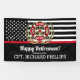 Ein lustiges Feuerwehrflaggendesign mit Ihren persönlichen Glückwünschen zum Ruhestand. Verziert mit einem edlen Gold und einem roten Malteschneid und Lorbeerkranz.