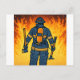 This postcard features a bold illustration of a firefighter standing firmly against raging flames.