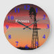 Ein Feuerwehrkansas Sonnenuntergang mit einer Windmühle-Silhouette, hell und farbenfroh, auf einer Runduhr. Nördlich von Hutchinson Kansas USA ist das hell und farbenfroh.