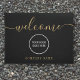 Elegantes personalisiertes Firmenlogo und Namenstor mit Ihrem Firmennamen Set in einem klassischen Goldtext auf schwarzem Hintergrund mit der Nachricht "Begrüßung", die Set in einem eleganten goldenen Schriftzeichen ist. Personalisieren Sie Ihre Details und passen Sie die Farbe an die Farbe Ihrer Wahl an. Entwickelt von Thisisnotme©