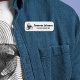 Anpassbare, einfache Namensschild mit dem Logo. Wählen Sie die Option Backupoption (traditioneller Button- oder Magnetverschluss) und fügen Sie Text und Logo hinzu.