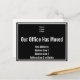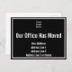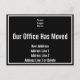 Oben befindet sich ein Display, das Sie durch Ihr Firmenlogo ersetzen können. Darunter befindet sich Text für eine benutzerdefinierte Nachricht (angezeigt: Unser Büro hat sich bewegt). Unten sind vier Zeilen Text für die neue Adresse. Die Postkarte ist schwarz. Der Text ist weiß.