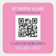 Personalisieren Sie Ihren QR Code in jeder dunklen Farbe. Fügen Sie Ihren Firmennamen, Ihre Website, Ihre Nachricht und Ihr Telefon in weißem und dunkelblauem Text auf rosa ein.