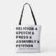 Stylish tote bag listing the freedoms granted by the First Amendment. Available in white or black.