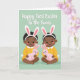 This design shows two nearly identical young children posed side by side on a soft pastel green background, arranged like a mirror image for a balanced, together-forever look. Each child has a dark complexion, curly dark hair, and a golden-yellow tunic with a bright white collar, creating a sweet matched-outfit moment that reads like close friendship. They wear headbands with tall ears lined in pink 🐰, adding a springtime touch without overpowering the scene. In their arms, each one holds a soft pink stuffed long-eared animal, and the way they cradle them close suggests a gentle, affectionate bond between the pair. Their wide eyes and rosy cheeks feel tender and connected, with a tiny first tooth peeking from one child’s smile as if they’re sharing the same happy secret. Near the top, a short line of white text sits centered above them, standing out clearly against the green backdrop. Small fluffy tails peek behind their outfits, and the pink ear linings echo the blush tones in their cheeks 🌷.