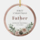 First Christmas as Father Personalized with Baby's Name, Birthdate, and Photo Round Ceramic Keepsake Ornament... A sweet bouquet of pink roses, pine cones, and holiday season botanicals decorates the rose gold metallic frame circling the text on front of your Christmas ornament gift for fathers. On back of the ornament is the baby's photo also framed by metallic rose gold. The example wording on this keepsake ornament reads "First Christmas as Father of Bethany Westfield 05.15.2025". All example text and the placeholder photo can be easily revised with your own on the personalization template.