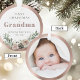 First Christmas as Grandma Personalized with Baby's Name, Birthdate, and Photo Round Acrylic Keepsake Ornament... A delicate bouquet of pink roses, pine cones, and holiday season botanicals decorates the rose gold metallic frame circling the text on front of your Christmas ornament gift for family members. On back of the ornament is the grandchild's photo also framed by metallic rose gold. The example wording on this keepsake ornament reads "First Christmas as Grandma of Bethany Westfield 05.15.2025". All example text and the placeholder photo can be easily revised with your own on the personalization template.