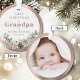 First Christmas as Grandpa Personalized with Baby's Name, Birthdate, and Photo Round Acrylic Keepsake Ornament... A beautiful bouquet of pink roses, pine cones, and holiday season botanicals decorates the rose gold metallic frame circling the text on front of your Christmas ornament gift for family members. On back of the ornament is the grandchild's photo also framed by metallic rose gold. The example wording on this keepsake ornament reads "First Christmas as Grandpa of Bethany Westfield 05.15.2025". All example text and the placeholder photo can be easily revised with your own on the personalization template.