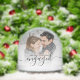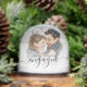 Commemorate your engagement with this beautiful modern keepsake snow globe. The text of Side 1 reads "Our first Christmas engaged," with the word "engaged" in elegant black handwriting script with flourishes before and after. On Side 2, add your names in the same black calligraphy script, with the year below in sans serif font. Replace the two sample images with your favorite photos. A white gradient filter helps make the text pop.