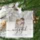 Commemorate your engagement with this beautiful modern keepsake ornament. The black text reads "Our first Christmas engaged," with the word "engaged" in elegant handwriting script with flourishes before and after. Replace the sample image with your favorite photo, and add your names and the year. A white gradient filter helps make the text pop.