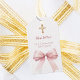 A white background color. Decorated with a large pink bow and a golden cross. Personalize and add the name and date.