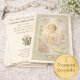 This exquisitely adorned holy card features the Christ Child in a moment of deep Eucharistic reverence. Clothed in a rose-hued tunic and crowned with a golden halo, the Infant Jesus gently raises a radiant Host inscribed with “IHS,” while lovingly clasping a golden chalice—symbols of His Real Presence in the Blessed Sacrament. Two adoring angels hover above in prayerful awe, their presence a reminder of Heaven’s nearness at every Holy Communion. Surrounded by a garland of blooming roses and lilies, the image is framed in an ornate liturgical gold border with intricate Eucharistic detailing, including a chalice motif and decorative sacred flourishes. Ideal for First Holy Communion, Eucharistic Adoration, or as a cherished devotional keepsake, this card draws the soul into the mystery of Divine Love.