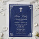 Erste Einladungskarten der Heiligen Kommunion mit einem schönen Kreuz- und Regalgeflecht. Die Typografie der Karte vereint elegante Kalligrafie mit modernem Text ganz in Weiß auf einem dunkelblauen Hintergrund. Auf der Rückseite der Karte befinden sich auch das Kreuz und der gewebte Rahmen auf marineblau. Erhältlich in hoher Druckqualität oder als Download, mit sofortigem digitalen Download-Format für Textnachrichten, E-Mail oder Social Media-Beiträge.