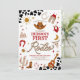 Saddle up for a fun-filled celebration with this Western-themed first rodeo birthday invitation! Featuring cowboy hats, boots, lassos, cacti, and rustic cow print accents, this design perfectly captures the spirit of the Wild West. Ideal for a childs milestone first birthday, it sets the tone for a lively rodeo party full of adventure. Personalize easily with your event details and create a keepsake guests will love.