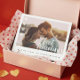 Erinnern Sie sich an Ihre erste Valentinin als Mr. und Mrs. mit unserer modernen und minimalen Valentinstag Paar Foto Sake-Plakette. Das Design verfügt über ein minimales Single Foto Layout, um Ihr eigenes Foto anzuzeigen. Kleines, weißes Herz-Overlay-Detail mit "First Valentine's", über dem Foto angezeigt wird, ist die weiße moderne Kalligraphie. Personalisieren Sie mit Ihrem Namen und Jahr.