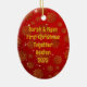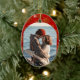 Oval, ceramic Christmas ornament for a dating couple. Add your favorite photo to the arch-shaped template. Background is red twinkling stars and gold snowflakes. On the back, include information. Sample text is names, "first Christmas together", with location and date.