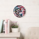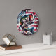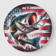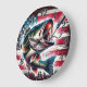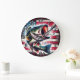 Diese Wanduhr wird mit einem Amerika-Fisch-Kunstdruck gezeigt.