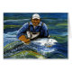 Eine Malerei eines Fischers im Wasser mit einem Lachs.