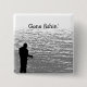 Lasst uns davon wegkommen und angeln gehen! Einfache Anpassung oder Entfernung des Textes auf diesem Button, das ein Schwarz-Weiß-Bild eines einsamen Fischers zeigt, stehend auf einem Felsvorsprung am Seneca See in Genf, New York. Der Text lautet: Gone fisin'