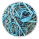 Ein farbenfroher Entwurf des Fischernetzes und leuchtend blaues Seil aus einem Boot, das auf dem Hafensteg gelagert ist.