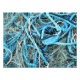 Ein farbenfroher Entwurf des Fischernetzes und leuchtend blaues Seil aus einem Boot, das auf dem Hafensteg gelagert ist.