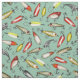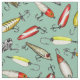 Dieser Stoff hat fischen Lure Illustrationen inspiriert durch Vintage Fischköpfe in Rot-Gelb-Tönen auf einem blassen aquamarinen Hintergrund.