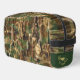 Hunting and fishing toiletry bag featuring a khaki green and brown bullrushes camouflage print pattern. There's a customisable text area on the front, where you can add a name or message. Plus, a monogram area on the right-hand side to add your own initials