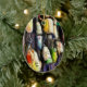 Dieser Weihnachtsschmuck zeigt ein beeindruckendes Bild von Fischerbooten auf einem rustikalen Gebäude.