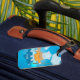 Cute blue kid luggage tag with cartoon polar bear holding a fishing rod and a bucket full of fish .