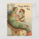 Das Vintage Postkartendesign mit einem Mutterfisch, der auf einem Hocker sitzt und ihrem Baby eine Flasche füttre. Anpassbarer Text oben "Glücklicher Muttertag"