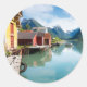 Rundaufkleber mit den farbenfrohen Häusern des kleinen Dorfes Fjaerland mit Reflexion im Wasser des Fjaerlandsfjords, einem Zweig des Sognefjords, umgeben von großen Bergen in Sogn og Fjordane, Norwegen.