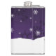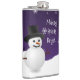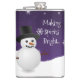 Profitez de votre boisson préférée pour adultes avec ce fabuleux flacon de Noël de la scène d'hiver de Snowman violet. Le design de flacon présente un bonhomme de neige heureux dans une scène hivernale enneigée contre un arrière - plan violet orné de flocons de neige de couleur assortie et le dicton "Making Spirits Bright" que vous pouvez laisser ou personnaliser avec votre propre dicton. Autres cadeaux et objets de vacances disponibles avec ce design aussi.