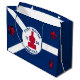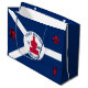 Große Geschenktasche mit Fahne der Stadt Fort Wayne, Indiana; blaue und weiße Flagge und rote Blockhütte in der Mitte und drei Illustrationen im blauen Feld - Illustration des Kopfes der Ureinwohner Amerikas, französischer Flohblütler und britischer Löwe