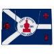 Große Geschenktasche mit Fahne der Stadt Fort Wayne, Indiana; blaue und weiße Flagge und rote Blockhütte in der Mitte und drei Illustrationen im blauen Feld - Illustration des Kopfes der Ureinwohner Amerikas, französischer Flohblütler und britischer Löwe